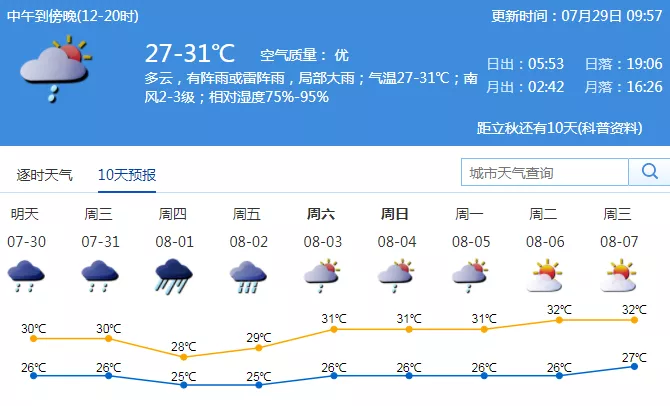 周一至周三有雷阵雨,局部暴雨;周四至周五有一次暴雨降水过程;周末期间(8月3-4日)有阵雨或雷阵雨。