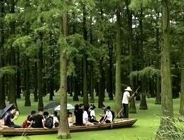 视频中,一船游人泛舟“水上森林”,小船悠悠荡荡,从水上轻滑而过。高大的水杉为游人编制了天然屏障,蝉鸣声声,绿荫蔽日,让绿林显得格外清幽、静谧。十几秒的视频配合舒缓的音乐,一幅绿意盎然的盛夏风光,呈现在全球网友面前。