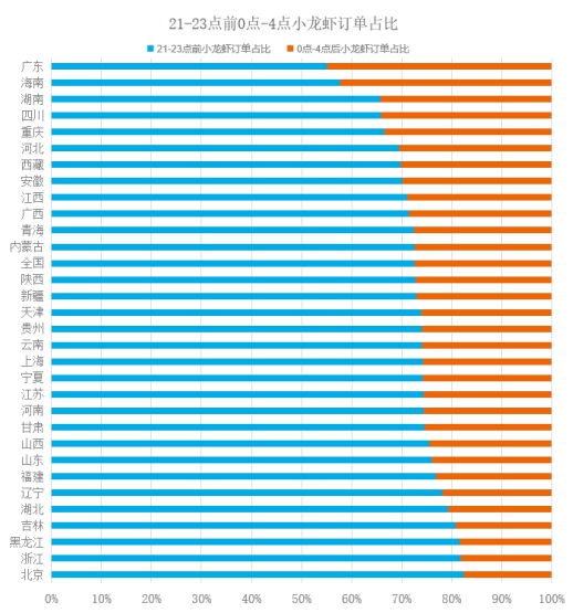 小龙虾作为深夜美食,不同的地区有不同时间选择偏好。北京的小龙虾订单超8成发生在转钟前,在深夜0点之前小龙虾订单占比最高的前3名是北京、浙江、黑龙江,这三个地区的消费者为小龙虾熬夜的程度相对较低。在0点之后,对于广东、海南和湖南地区的消费者来说,夜晚的精彩生活才刚刚开始,这三个地区0点后的小龙虾订单占比较高,广东有45%的小龙虾订单发生在0点后。
