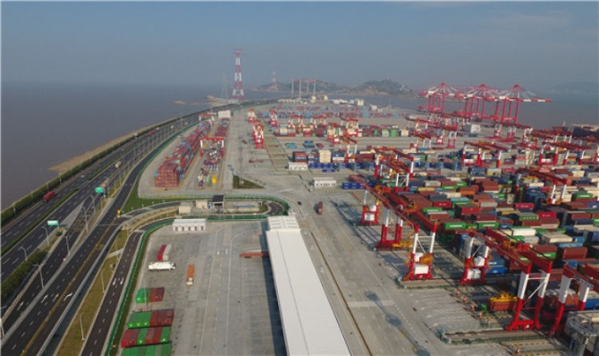 这是2018年7月25日无人机拍摄的上海洋山深水港四期自动化码头。新华社记者 丁汀 摄