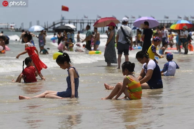 广西北海市,在“中国第一滩”银滩景区,众多游人在海边戏水游玩。