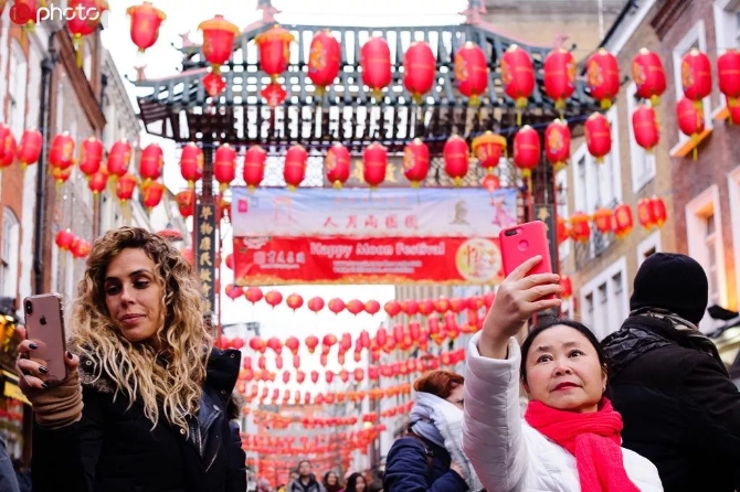 2019年2月2日,英国伦敦,唐人街张灯结彩迎中国农历新年到来。