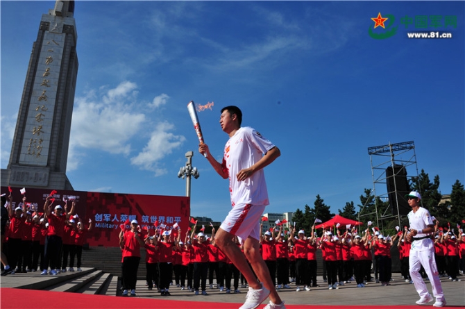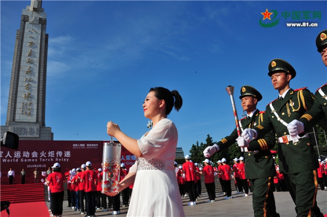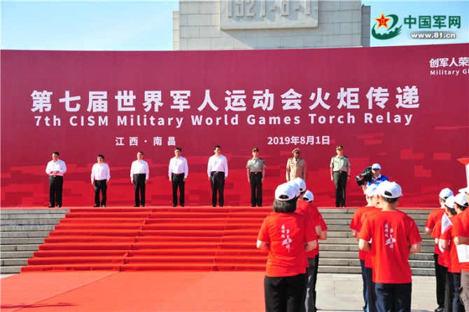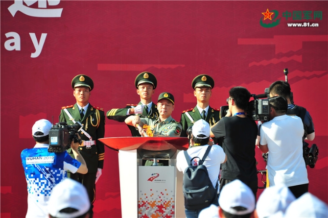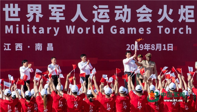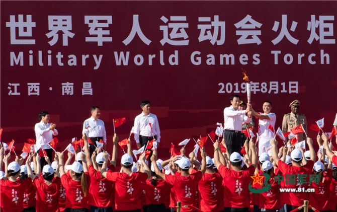 这来自人民军队诞生地的火种,点燃了安放在八一南昌起义纪念塔前的圣火盆,随后由国际军事体育理事会秘书长曼比·科伊塔点燃第一支火炬。