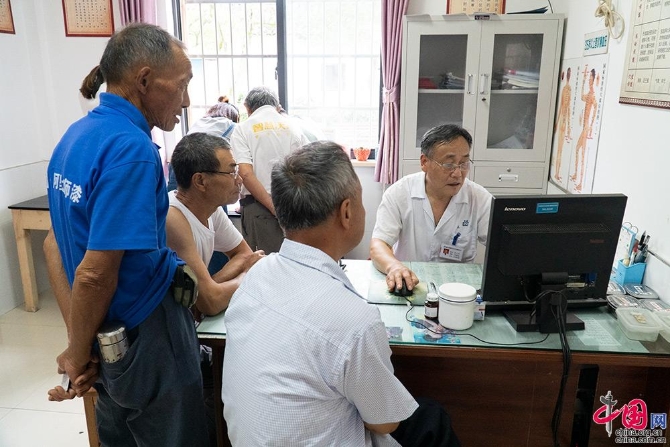 北团村社区医院的医务室里柏志华正在为村民看病。 中国网 杨佳 摄影
