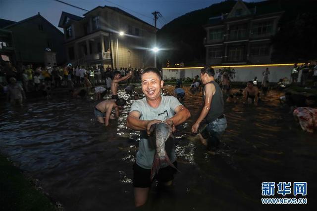 游客在杭州市富阳区胥口镇上练村参加趣味摸鱼活动(7月26日摄)。新华社记者徐昱摄