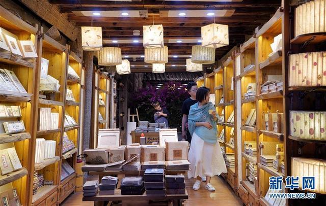 游客在云南丽江古城挑选东巴纸文创产品(6月6日摄)。新华社记者秦晴摄