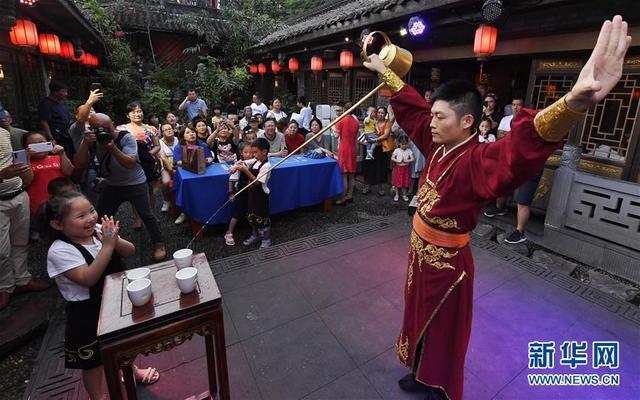 食客在成都市宽窄巷子景区内的火锅店观看功夫茶表演(8月4日摄)。新华社记者刘坤摄