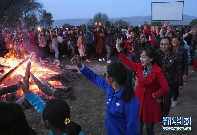 游客和当地群众在甘肃省临洮县马家窑村围着篝火跳舞(5月15日摄)。新华社记者马宁摄
