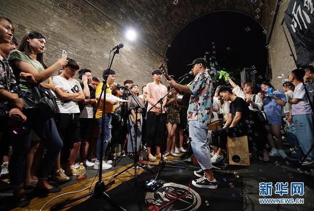 人们在西安城墙南门下观看乐队表演(7月4日摄)。 新华社记者邵瑞摄