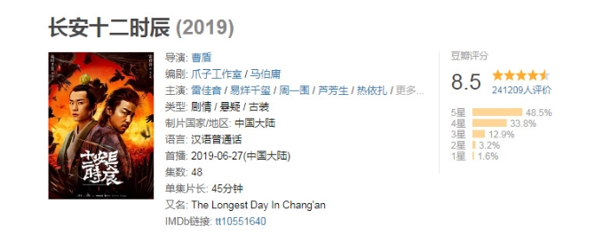 截至8月13日早上9点,《长安十二时辰》豆瓣8.5分(24万人打分)