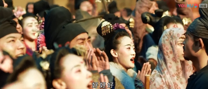 剧集的主线是高度紧张的,但“日常”恰恰是悠闲的、不紧不慢的,二者之间是冲突的。比如第9集,张小敬被捕,命悬一线,崔器带兵想去增援张小敬,却被人群困在这里动弹不得。这时剧集开始长达4分钟的歌舞片段,擂台上的舞姬在翩翩起舞,许鹤子在一旁随着音乐唱歌,崔器和士兵们情不自禁跟着许鹤子一起哼唱,全然忘记了张小敬被困的事。