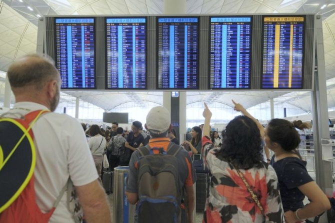 8月14日,旅客在香港国际机场航班动态显示屏上查看航班动态。新华社记者 王申 摄