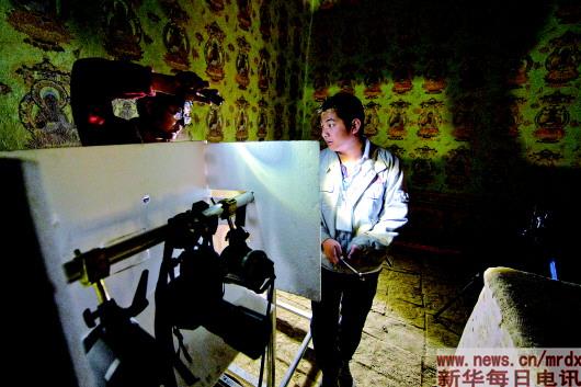 ▲工作人员对莫高窟第152窟进行数字化采集。 摄影:本报记者陈斌