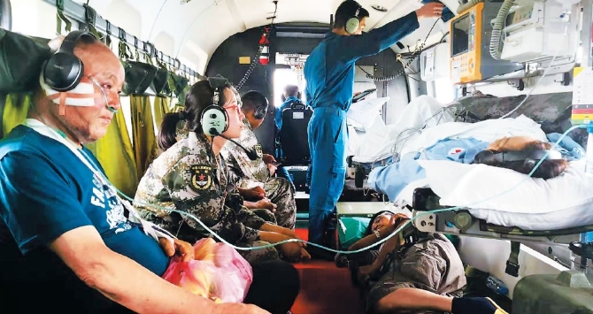 8月22日,受伤中国游客在我军“和平列车”医疗队军医护送下,乘直-8G新型加改装救护直升机回国。徐 智摄
