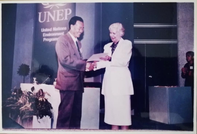 1994年6月兰州局集团公司中卫工务段张克智代表中卫固沙林场从时任联合国副秘书长伊丽莎白手中接过联合国环境规划署颁发的“全球环境保护500佳先进单位”证书