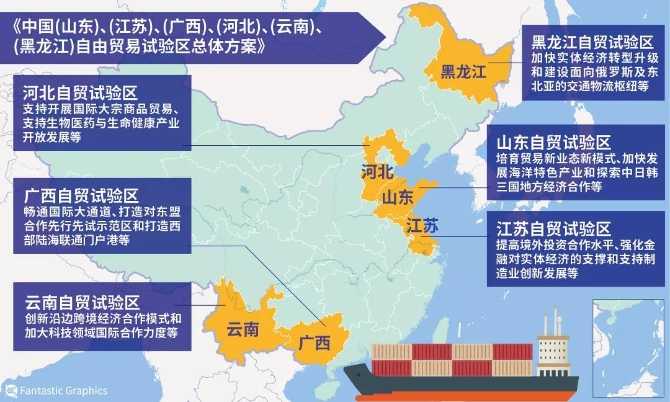 国务院日前印发《中国(山东)、(江苏)、(广西)、(河北)、(云南)、(黑龙江)自由贸易试验区总体方案》,决定在山东、江苏、广西、河北、云南和黑龙江等5省1区建立新的自贸试验区。中国的自贸试验区建设由此迈入新阶段,这也显示了我国国内经济体制改革的深化又向前迈出了重要一步。