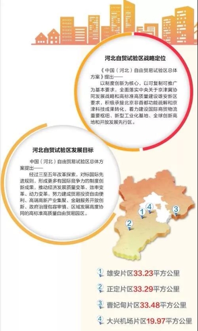 以河北自贸试验区来说,它的实施范围超过100平方公里,涵盖雄安、正定、曹妃甸和大兴机场四个片区,而这四个片区各有其不可替代的优势。按照国务院的要求,它们除了承担和其他自贸区相同的制度创新、深化投资领域改革、推动贸易转型升级等功能以外,还承担着开展国际大宗商品贸易、建设国际商贸物流重要枢纽、增强金融服务功能、推动高新技产业开放发展、完善装备制造产业开放创新、建设数字商务发展示范区等职能,其中有不少任务正是河北具有产业优势的。
