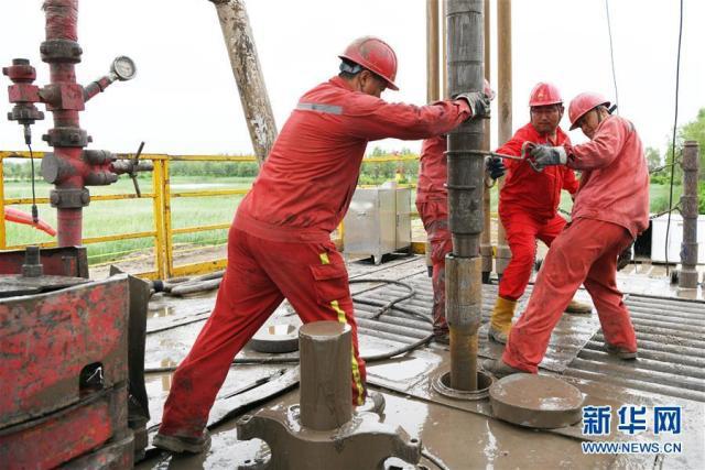 大庆油田1205钻井队的第21任队长张晶(右二)与工人们在进行作业(6月27日摄)。新华社记者 王建威 摄