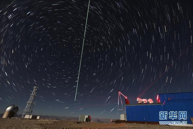 在西藏阿里观测站,“墨子号”量子科学实验卫星过境,科研人员在做实验(2016年12月10日摄,合成照片)。新华社记者 金立旺 摄