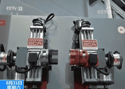 蜘蛛机器人旁边的这组机械臂也同样展示了智能柔性关节在高速运动中实现精密対插和零碰撞的特性。
