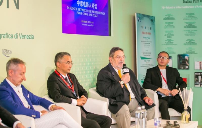 8月29日,第76届威尼斯电影节“聚焦中国”活动中意电影人对话环节在威尼斯举行。中国青年导演樊昊仑(左1)和上海电影学院副教授曲丽萍(右2)等嘉宾在活动上对话。