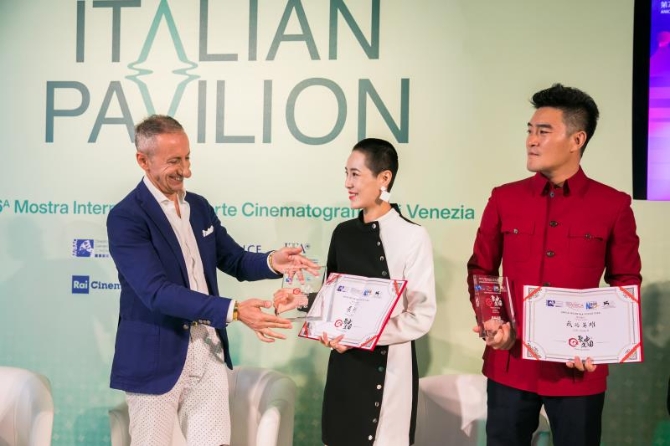 8月29日,第76届威尼斯电影节“聚焦中国”活动中意电影人对话环节在威尼斯举行。活动上,意大利国家电影音像和多媒体工业协会国际部主任罗伯托·斯塔比莱(左),向参加本届威尼斯电影节“聚焦中国”特别市场展映活动的中国影片《我的英雄》导演樊昊仑(右1)和女主角景珂(中)颁发活动“焦点影片”和“焦点女演员”荣誉证书。