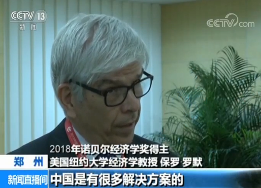 2018年诺贝尔经济学奖得主 美国纽约大学经济学教授 保罗·罗默:中国是有很多解决方案的,比如说我观察到,决策层设计了一个很高的预期值,保证了经济的增长。我觉得这是一个很好的办法,值得其他国家来借鉴。