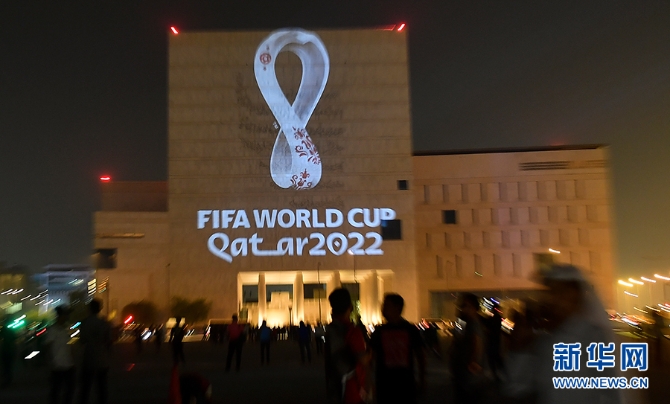9月3日,2022年卡塔尔足球世界杯会徽投影在多哈瓦吉夫老市场的墙面上。 当日,2022年卡塔尔足球世界杯会徽向全球发布。 新华社发(尼库/摄)