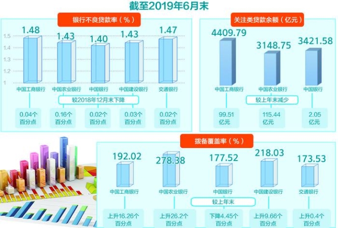 具体来看,截至今年6月末,中国工商银行、中国农业银行、中国银行、中国建设银行、交通银行的不良贷款率分别为1.48%、1.43%、1.40%、1.43%、1.47%,分别较2018年12月末下降0.04个百分点、0.16个百分点、0.02个百分点、0.03个百分点、0.02个百分点。