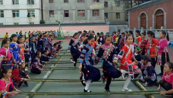 云南省普洱市墨江县城小学将国学与民族传统体育项目相结合。“人之初,性本善。性相近,习相远。”课堂上,孩子们在老师的带领下,将《三字经》的韵律融入哈尼族传统体育项目——竹竿舞中。下课后,孩子们纷纷表示这样的教学方式,使得他们将“《三字经 》背得更熟了。”