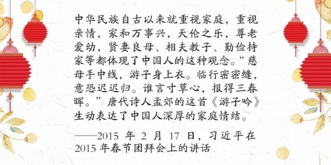 在2017年春节团拜会上,习近平连用三个“不要”提醒大家,再拼也不要遗忘了人间真情。总书记的“家常话”,关怀了多少四处奔波的追梦者,点醒了多少埋头忙碌的职场人。曾几何时,距离太远、工作太忙、日夜打拼等等,经常成为人们忽略亲情的借口。血脉亲情,隔山隔水隔不断,团圆和睦是中国人传统而朴素的愿望,总书记提醒人们要格外珍视至亲至美的人间真情。