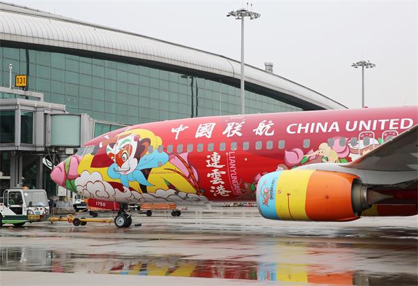 据中国联合航空相关负责人介绍,连云港市位于江苏省的北部,是孙悟空故事的发源地之一。这架西游记主题彩绘机“连云港号”,是中国联合航空公司、连云港市文化广电和旅游局联合上海美术电影制片厂携手打造的全球首架全机体西游文化主题彩绘机。