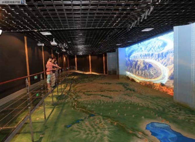 △黄河博物馆的黄河流域沙盘演示。内蒙古托克托县河口镇以上为黄河上游,河口镇至河南郑州桃花峪为中游,桃花峪以下至入海口为下游。