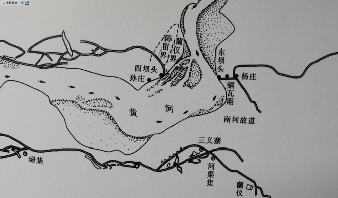 △东坝头是黄河九曲十八弯最后一道弯所在地。1855年(清咸丰五年),黄河在河南兰阳(今兰考)北岸铜瓦厢决口,洪水向北夺大清河入海,结束了黄河近700年南下夺淮入海的局面。这是黄河距今最近的一次大改道。这是黄河博物馆展示的铜瓦厢河决示意图。
