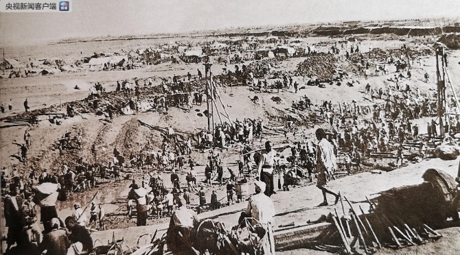△人民胜利渠是黄河下游兴建的第一个大型引黄自流灌溉工程。工程于1951年3月开工,1952年第一期工程竣工,这是修建总干渠时繁忙的施工场景。(黄河博物馆提供)