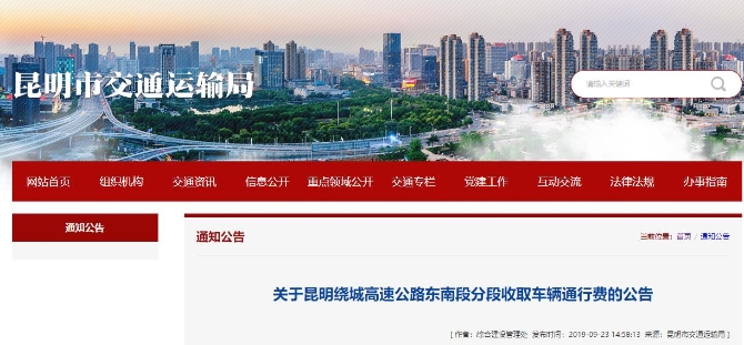 9月24日,掌上春城记者从昆明市交通运输局官网获悉,昆明市交通运输局于日前发布《关于昆明绕城高速公路东南段分段收取车辆通行费的公告》。《公告》指出,昆明绕城高速公路4座匝道收费站经交工验收合格后,具备试运行条件,定于2019年9月30日上午11:00整对过往车辆收取通行费。