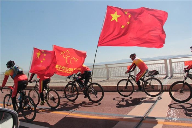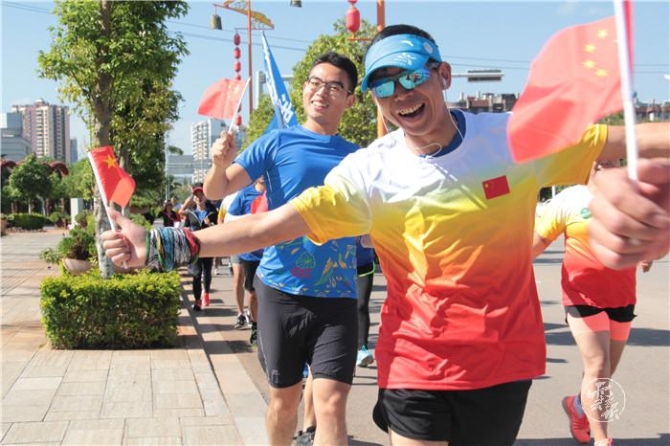 一路上,志愿者们挥动小国旗,一路高唱《我和我的祖国》等爱国歌曲,嘹亮的歌声回荡在滇池南岸。
