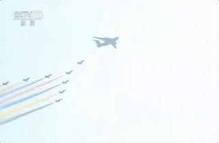 运用直升机编组字样、飞机喷拉彩烟、空地旗帜展示等形式,寓意在伟大、光荣、正确的中国共产党坚强领导下,新中国建设发展走过的70年辉煌历程,人民军队现代化建设取得的历史性成就。