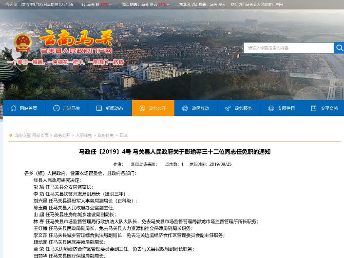 6686体育讯 机器人小明 9月16日,马关县人民政府发布了三十二位同志的任免职通知,其中,彭瑜任马关县公安局督察长,李功任马关县扶贫开发局副局长(挂职三年)。详情如下: