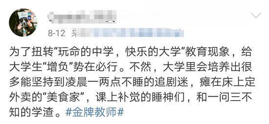 2018年6月中旬,教育部部长陈宝生在新时代全国高等学校本科教育工作会议上表示,中国教育“玩命的中学、快乐的大学”的现象应该扭转。高校对大学生要合理“增负”,提升大学生的学业挑战度,合理增加大学本科课程难度,拓展课程深度,扩大课程的可选择性,激发学生的学习动力和专业志趣。