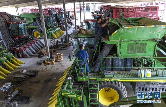 在位于新疆生产建设兵团第六师五家渠市的新疆准噶尔银丰农机装备有限公司内,检修人员在检修保养采棉机(7月31日摄)。 新华社记者 王菲 摄