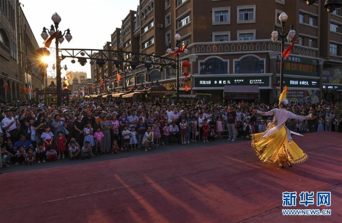 在位于乌鲁木齐的大巴扎景区,游客在观看歌舞演出(7月24日摄)。新华社记者 王菲 摄