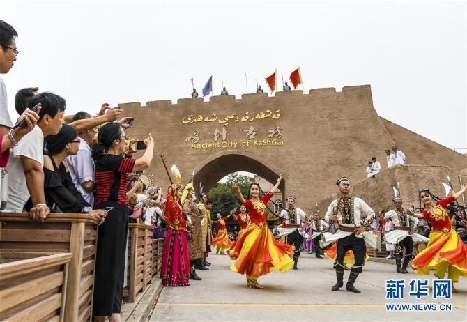 游客在新疆喀什古城景区开城仪式上观看歌舞表演(8月13日摄)。 新华社记者 王菲 摄