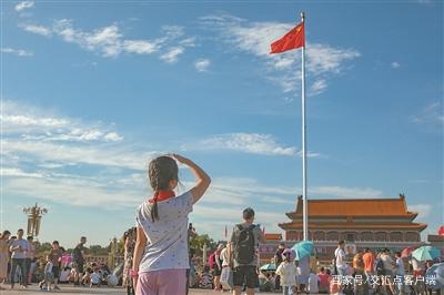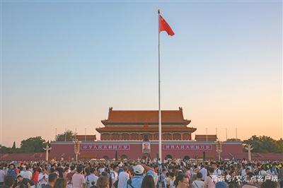 凌晨两点的天安门,等待通过安检观看升旗仪式的游客已排起近百米长队。广场上众人伫立,静静等待国旗升起。太阳跃出地平线,国歌声响彻天安门广场,来自福建的三年级小学生,高举右臂,向国旗敬礼。