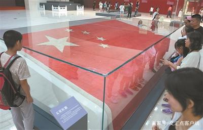 中国国家博物馆展厅里,开国大典时毛主席按下电钮升起的五星红旗、曾联松设计的国旗图案原稿、杨利伟航天服左臂上的五星红旗……旗帜已刻上时代烙印。