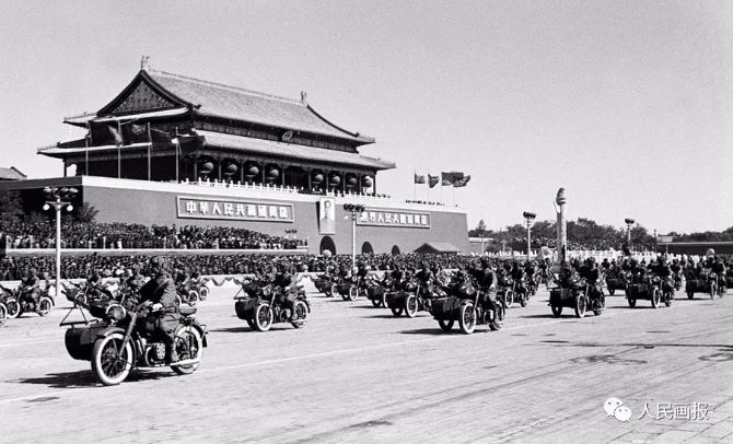 公安部队首次参阅。本次阅兵的亮点是民兵方队成员来自汉族和多个少数民族,他们穿着五颜六色的民族服装,手中拿着新式轻武器。160辆摩托车载着步兵方队,浩浩荡荡。(资料图)