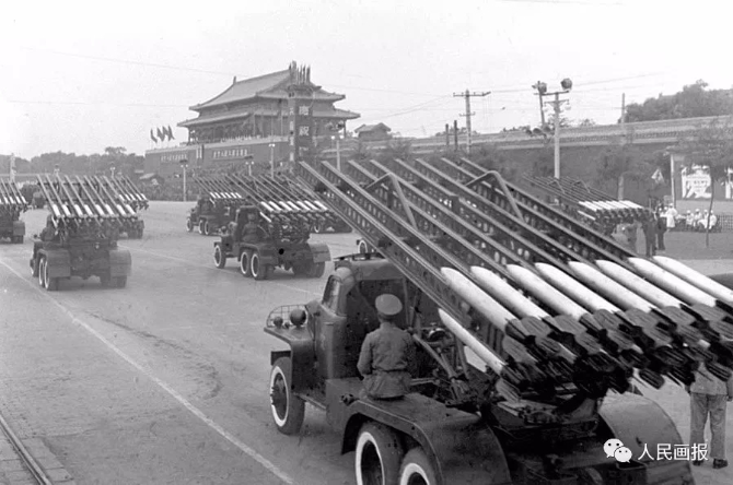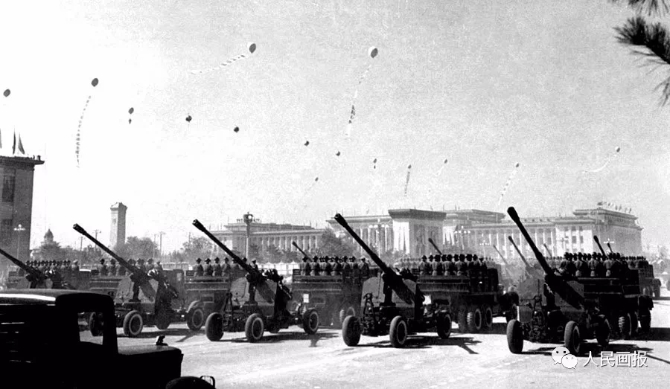 中国人民志愿军代表团出现在天安门观礼台上。火箭炮兵方队第一次出现在受阅队伍中。此次阅兵,拖拉机牵引着加榴炮隆隆而过,“拖拉机拖炮”的新闻照片成为当时风靡全国的摄影佳作。(摄影:毛松友)