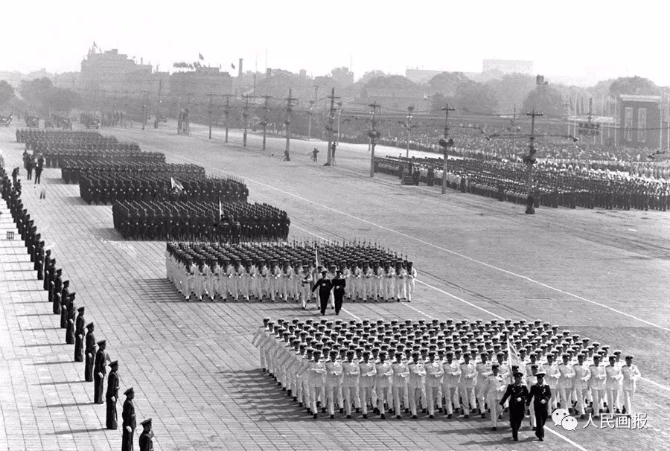 这是我军实行军衔制后的第一次阅兵。部队官兵穿着崭新的制式军服,佩戴军衔、领章,军容焕然一新。一位38岁的少将被挑选担任阅兵部队领队。彭德怀元帅身着崭新的礼服在杨成武上将的陪同下检阅了陆海空三军,周总理说:此举向全世界宣布,中国人民解放军结束了有军无将的历史!(摄影:谈培章、邹健东)