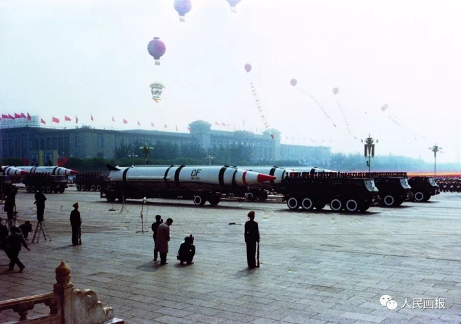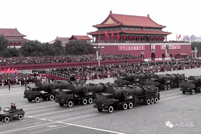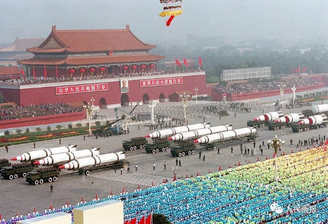 建国35周年庆,是新中国成立以来规模最大、装备最新、机械化程度最高的一次大阅兵。受阅部队的武器装备都是国产现代化兵器,海军导弹部队方队、空军地空导弹部队方队和战略导弹部队方队尤为引人注目。其中战略导弹部队是首次向世界亮相。(摄影:张韫磊、张赫嵩)