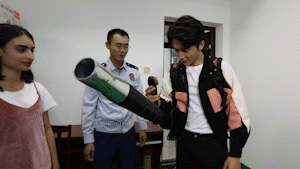 在胡显禄的陪同下,张新成和中国人民大学留学生叶峥峥(YeganehTavakoli)走进机动支队库房,亲身体验了以风灭火装备,他们不敢相信消防员们要背着这么重的装备爬坡上山。